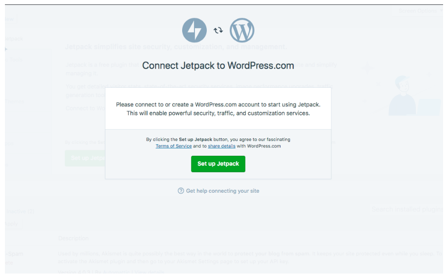After activating and installing Jetpack, you’ll need to connect it to WordPress.com. A WordPress.com account is required so that Jetpack can provide your site with stats and analytics about your traffic, site security, faster content delivery, sharing tools and multiple site management from one interface.